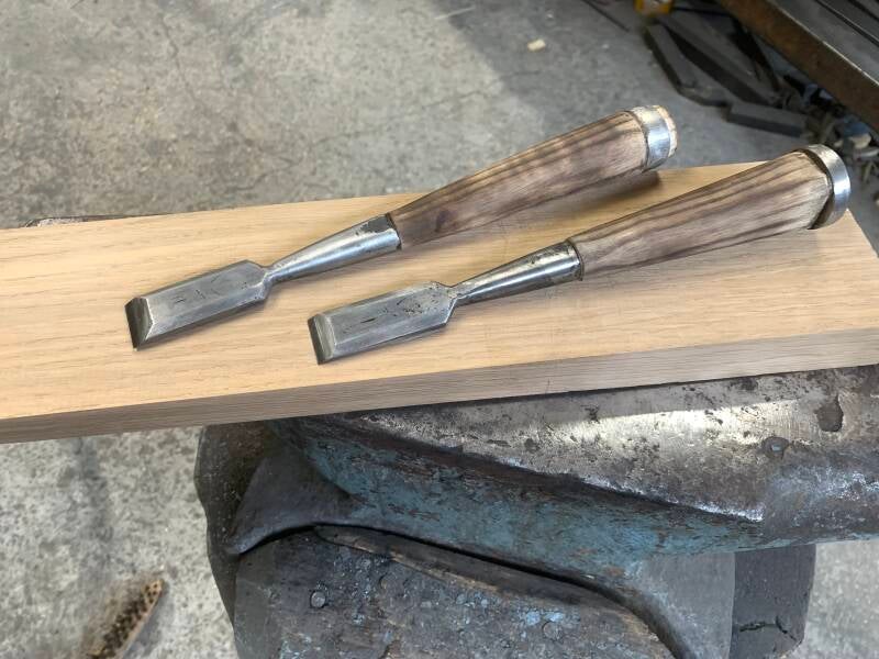 Prototypes de ciseaux à bois, corps acier doux, mise pour le tranchant en acier 90mcv8 pour ces deux modèles, dureté 60-62HRC. Affûtage à la main jusqu'au grain 8000. Toutes largeurs de fer possible ( de 5mm à 80mm pour ce genre d'outils)